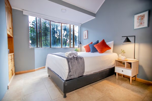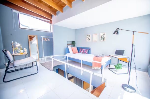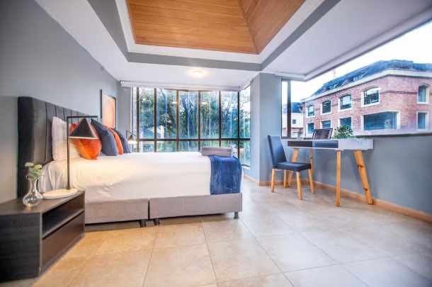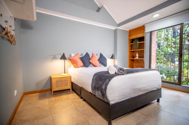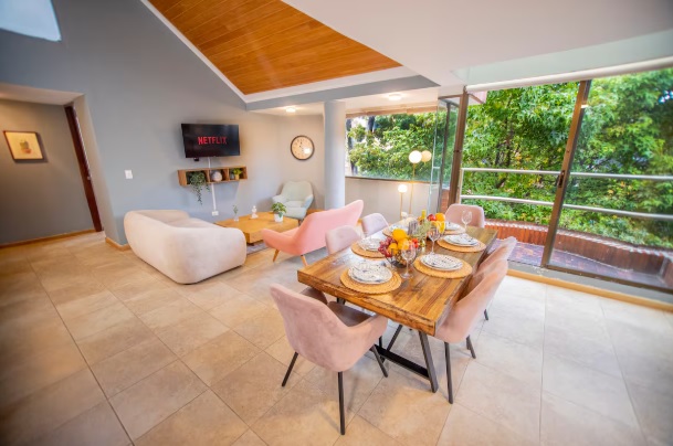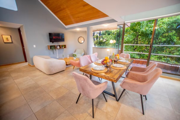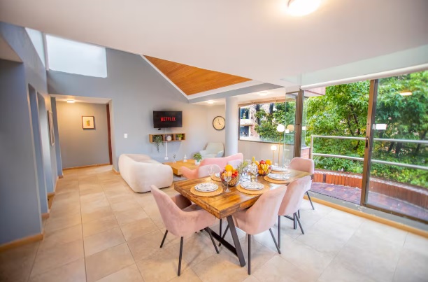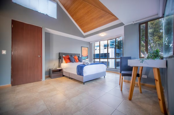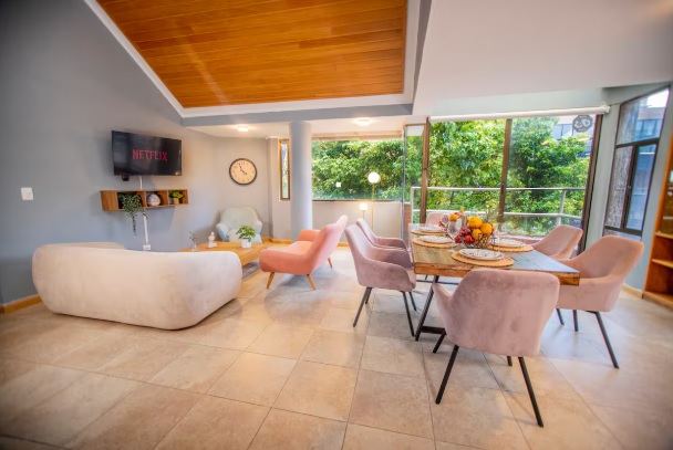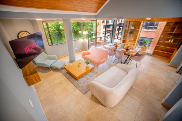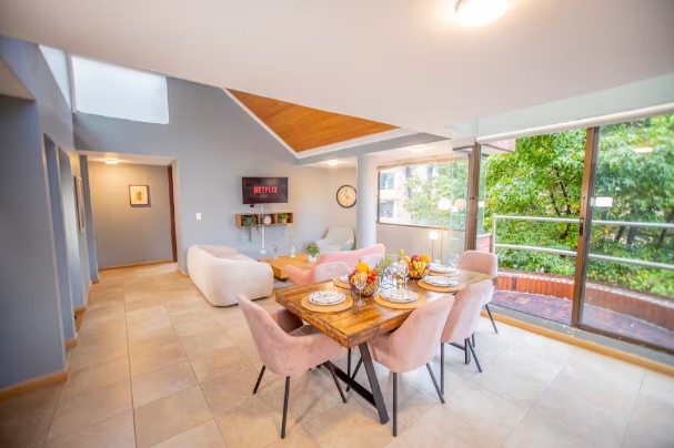 The penthouse is in Chicó, one of Bogotá’s most exclusive neighborhoods, known for its tranquility, green spaces, and high-quality residences. Guests have access to all amenities, and the building features water reserve tanks for convenience during planned water rationing.